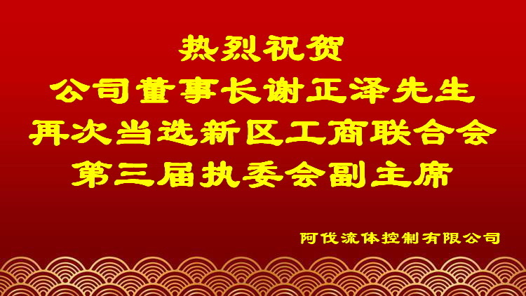 阿伐流体控制有限公司董事长谢正泽先生再次当选西海岸新区工商业联合会第三届执行委员会副主席,公司全体员工向董事长谢正泽先生再次当选表示热烈的祝贺。