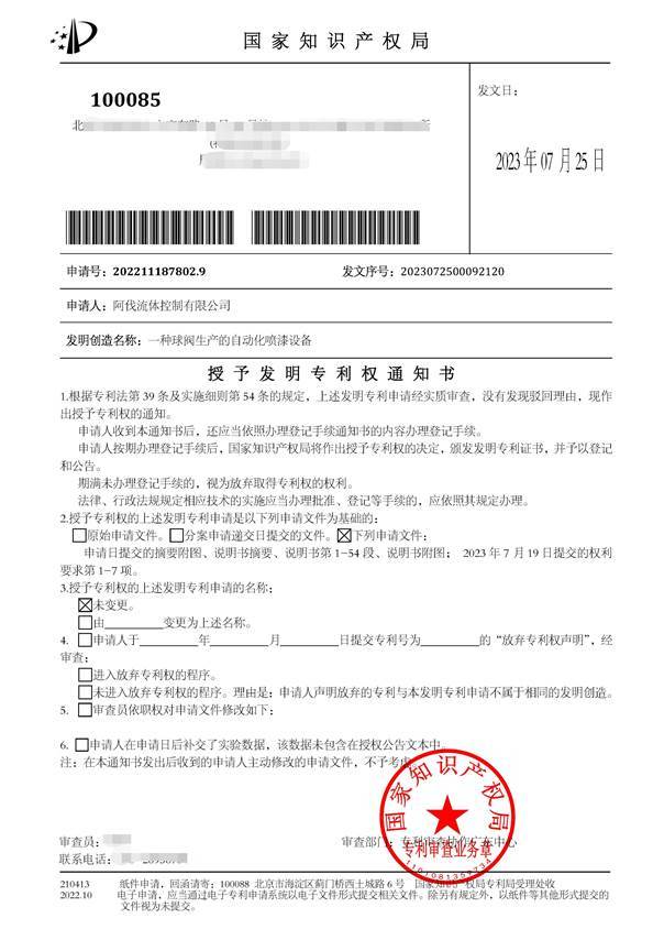 2023年7月25日,阿伐流体控制有限公司(以下简称“AFA公司”)再获两项国家发明专利授权,这是继今年6月份《一种耐磨C型球阀》获得国家发明专利后的又一重大突破。这两项发明专利分别名为《一种球阀生产自动化喷漆设备》和《一种具有调节功能的C型球阀》。至此,AFA公司获得国家发明专利授权数已达到4项。